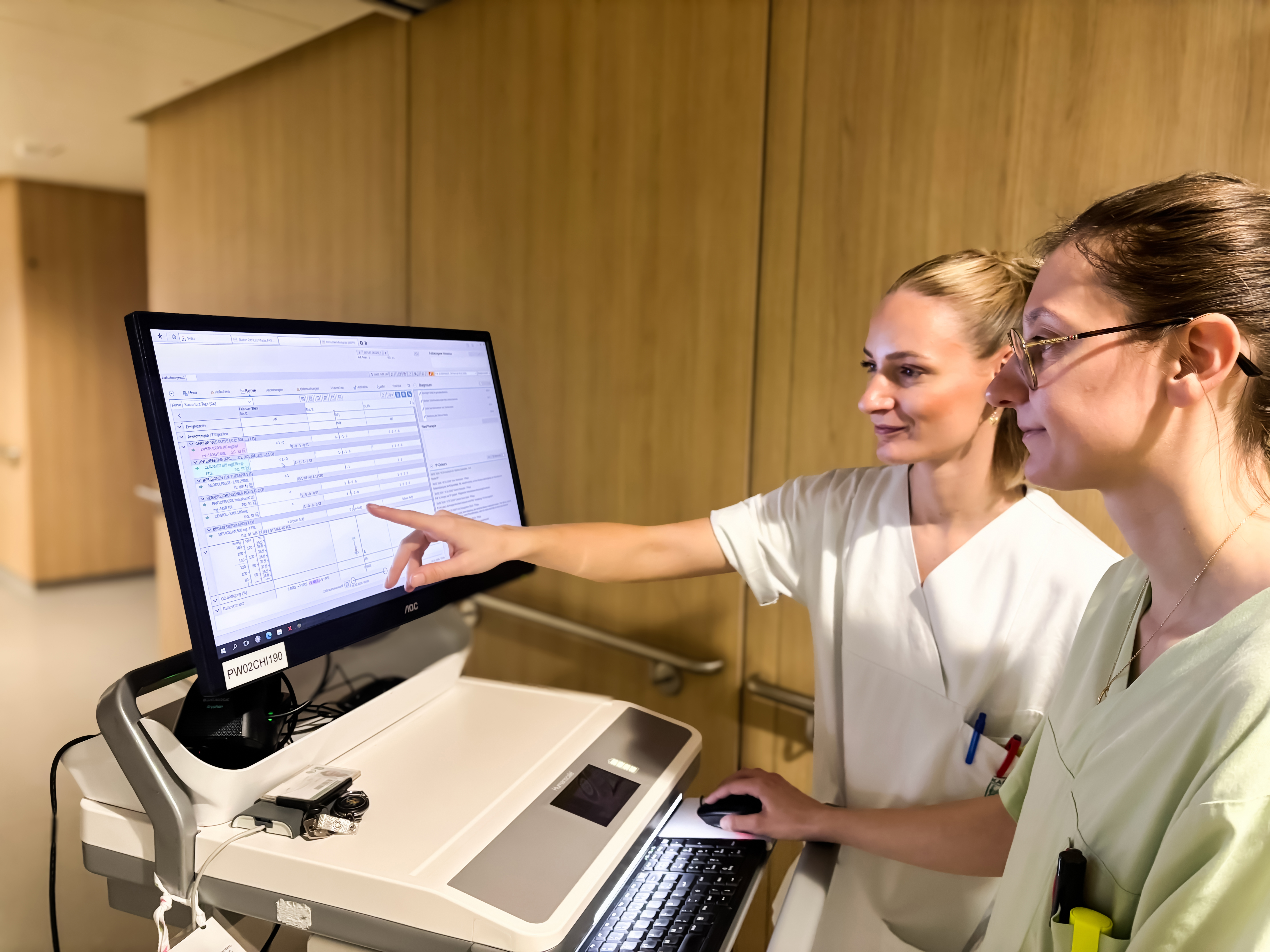 Zwei Mitarbeiterinnen arbeiten mit der elektronischen Fieberkurve
